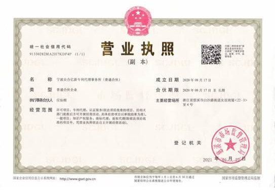 浙江億新知識產權服務有限公司前身為慈溪眾合知識產權代理事務所,創始于2004年,為了服務更多的創新企業,實現“服務億萬創新企業”的理念,后更名為浙江億新知識產權,旗下公司包括:寧波眾合億新專利代理事務所(機構代碼33405)、中范(北京)認證有限公司。其中寧波眾合億新專利代理事務所是慈溪市科技服務聯盟理事單位,前灣區知識產權工作站。公司位于浙江省慈溪市文化商務區友誼商廈,并在北京、青島設有辦事處。